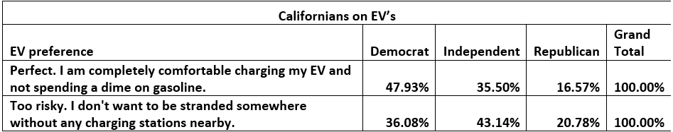 Democrats in California and New York were most comfortable with the EV option, with over 50% saying they were completely comfortable charging their cars and never spending a dime on gas again. In Texas and Florida, Democrats were less confident (only 23/33% were completely comfortable) and more concerned about getting stuck somewhere with no charging options.